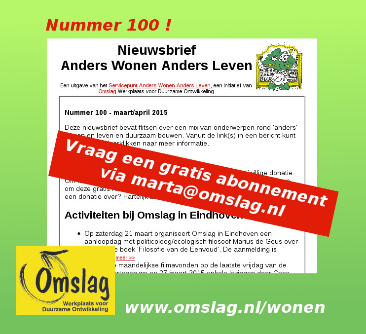 EINDHOVEN, 4 maart 2015 - Vandaag verscheen de honderdste editie van de elektronische nieuwsbrief Anders Wonen Anders Leven; een kleine mijlpaal in de geschiedenis van het gelijknamige servicepunt. De nieuwsbrief bevat een breed scala van nieuws, oproepen, vraag en aanbod van woongroepen, kennismakingsmogelijkheden met projecten en andere inspiratie rond sociaal-ecologisch gemeenschappelijk wonen; aangevuld met informatie over vernieuwende vormen van duurzaam bouwen. Lees de laatste nieuwsbrief hier www.omslag.nl Het Servicepunt Anders Wonen Anders Leven is een belangrijk onderdeel van het werk van Omslag Werkplaats voor Duurzame Ontwikkeling. Het servicepunt werd opgezet om te voorzien in de toenemende vraag naar informatie en voorbeelden van 'andere' vormen van ecologisch wonen en leven: in een woongroep, leefgemeenschap, ecowijk of -dorp, binnen een woon-werkpand of samen met anderen binnen Centraal Wonen of Gemeenschappelijk Wonen van Ouderen. Het Servicepunt, ondergebracht in de bibliotheek van Omslag in Eindhoven, werd in 2005 operationeel en wordt begeleid met een uitgebreide website www.omslag.nl Omslag-medewerkster Marta Resink is redacteur van de maandelijkse nieuwsbrief: ,,Al snel na de start van het Servicepunt bleek dit in een enorme behoefte te voorzien. We kregen steeds meer vragen over allerlei vormen van gemeenschappelijk wonen, van mensen die medestanders zoeken of aansluiting bij een bestaand project. Om vraag en aanbod bij elkaar te brengen, besloten we in januari 2006 een nieuwsbrief samen te stellen. Ook dat initiatief sloeg aan. Nu, tien jaar later, telt de nieuwsbrief zo'n 4.000 abonnees. De nieuwsbrief wordt ook telkens langer; het is lastig om telkens weer een selectie te moeten maken.'' Een abonnement is gratis, maar velen maken af en toe een vrijwillige donatie over om de productie van de nieuwsbrief te steunen. Het Servicepunt Anders Wonen Anders Leven is elke vrijdag van 14:00 tot 17:00 uur geopend voor bezoekers. Dan vinden soms ook lange gesprekken plaats rond het opzetten van een project, of met studenten of journalisten met gerichte belangstelling. De nieuwsbrief fungeert als interactief medium, wat betekent dat de lezers zelf ook informatie aandragen om breder te verspreiden. Marta Resink: ,,Het is enorm inspirerend en dankbaar werk om als een soort spil te fungeren in de wereld van gemeenschappelijk wonen. De belangstelling groeit met het jaar en gaat dwars door alle generaties heen. Telkens als er weer een project is gerealiseerd zit ik even te juichen. Er gebeurt zoveel - op allerlei terreinen, en het geeft heel veel voldoening om daarvan elke maand iets naar buiten te kunnen brengen.'' Abonneren op de nieuwsbrief: www.omslag.nl Donaties zijn welkom! www.omslag.nl De allereerste nieuwsbrief verscheen op 20 januari 2006. Nog te lezen! Editie #100 verscheen op 4 maart 2015 www.omslag.nl Website van het Servicepunt Anders Wonen Anders Leven www.omslag.nl Meer nieuws
