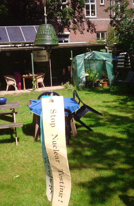 Het vredesklokje, gemaakt uit een speciale legering gietijzer die voor een heel fijne klank zorgt, is een traditie in Japan. De wind die het papier laat wapperen zal met het tingelen van het klokje ook de wens over de wereld verspreiden. Op 6 en 9 augustus 1945 verwoestten atoombommen de Japanse steden Hiroshima en Nagasaki. Er vielen honderdduizenden doden en nog veel meer gewonden. De overlevenden lijden aan ongeneeslijke erfelijke ziekten. Nog steeds wordt de mensheid bedreigd door deze vernietigende wapens. Amerikaanse kernwapens liggen klaar in Volkel (NB). Vredesgroepen spannen zich in om de kernwapens de wereld uit te krijgen. Omslag heeft al vele malen acties tegen kernwapens gesteund, zoals in 2014 de actie 'Wol tegen wapens'. Vredesactivisten breiden een vredessjaal van ruim 500 meter, die op zaterdag 9 augustus 2014 deel uitmaken van een reusachtig protest van elf kilometer lengte tegen de modernisering van de Britse kernwapens. De hele vredessjaal is te zien in het filmpje.