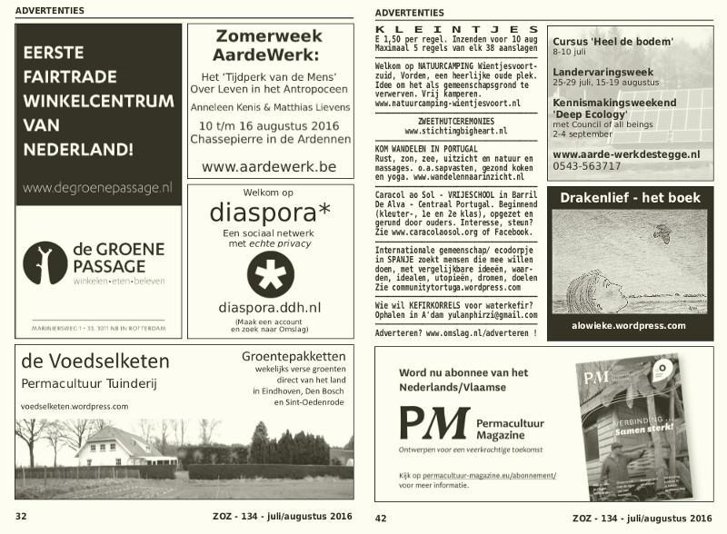 EINDHOVEN, 8 augustus 2016 - Er is nog ruimte beschikbaar op de advertentiepagina's van het september/oktobernummer van het tijdschrift ZOZ. Adverteerders kunnen dus nog eenvoudig hun boodschap verspreiden onder mensen die kiezen voor een duurzame leefwijze en daar in de praktijk vorm aan geven.