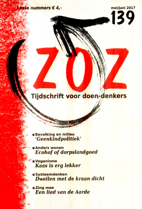 De Aarde draait„Ik draai, ik beef, ik bonk, ik ben, ik zweef mijn weg om de zon, ik gons, ik leef.” Elke dag klinkt het lied dezer dagen in de werkruimten van Omslag. Het is lente, alles gaat weer groeien. De wereld ziet er mooi uit. Eind april, vlak na het ter perse gaan van dit nummer van ZOZ, zouden we bij Omslag de Dag van de Aarde gaan vieren. Als deze ZOZ in de bus valt, is de dag alweer voorbij. In de aankondiging in het vorige nummer deden we een oproep: is er iemand die een Lied van de Aarde kan schrijven? Het was verrassend dat er verscheidene liederen werden aangedragen, waaronder de creatie van zangeres en tekstschrijver Wendy Lina, die afgedrukt staat in dit nummer van ZOZ. In het lied komt de Aarde zelf aan het woord. „Ik draai, ik beef, ik bonk, ik ben, ik zweef mijn weg om de zon, ik gons, ik leef.” De Aarde leeft haar eigen leven. En de mensen die zichzelf zo belangrijk vinden? Die komen maar zeer zijdelings ter sprake in het lied. „Kleine voetjes kriebelen mijn huid.” Intussen zijn de mensen met die kleine voetjes erg druk en ook daarover valt veel te lezen in dit nummer van ZOZ. Er is nog veel te doen om de Aarde mooier te maken en daarmee een betere plek om te wonen. Op veel terreinen kan het duurzamer en veel daarvan komt in dit nummer voor het voetlicht. Van het Monsanto-tribunaal tot inspirerende festivals, van een ecodorp tot de moestuin en de spullenbibliotheek. Wij wensen de lezers veel inspiratie en hopen dat ieder dit nummer van ZOZ met evenveel plezier zal lezen als waarmee wij het schreven. Er is vast iets bij om mee aan de slag te gaan en in praktijk te brengen. De Aarde draait door. Eens per jaar is er de internationale Dag van de Aarde op 22 april. Op die dag en op alle andere dagen zweeft de Aarde haar weg om de zon. Lang leve de Aarde.