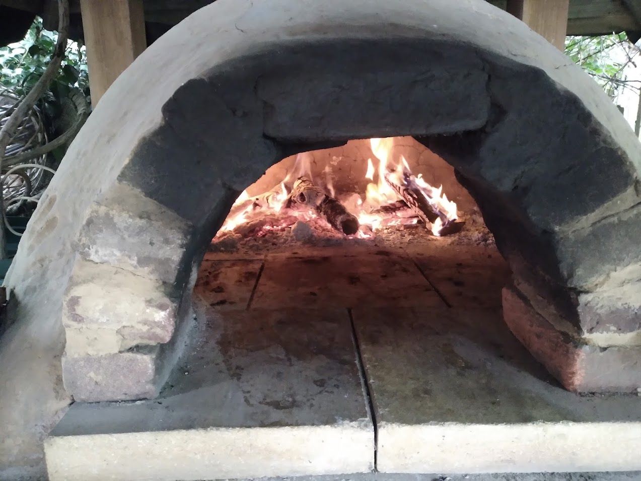 bakken van de zelfgemaakte pizza's in de leemoven.