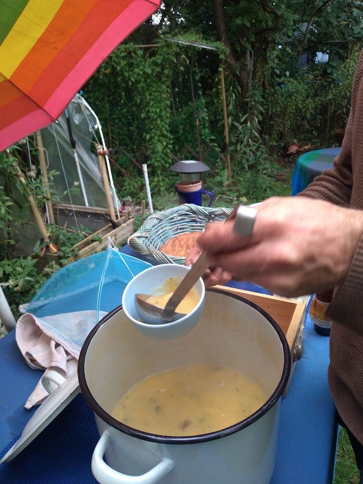 grote pan groentesoep gemaakt, met daarbij Turks brood