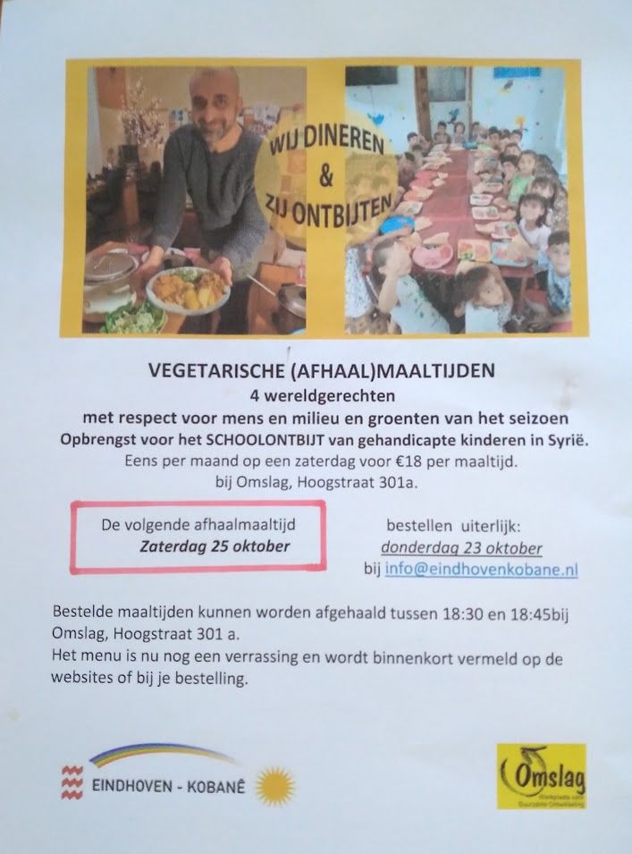 binnenkort op deze pagina. ![]() ![]() ![]() In plaats van afhalen, kun je om 18:45 ook aanschuiven aan tafel met de koks. Neem je eigen verpakking mee! De maaltijden kunnen worden verpakt in verschillende herbruikbare plastic bakjes en worden aangeboden in een papieren tas. ![]() ![]() In plaats van je maaltijd(en) afhalen en mee naar huis nemen, kun je ook aanschuiven bij een gezamenlijke maaltijd (in de zomer aan grote tafels in de tuin). Dat is ook een fijne gelegenheid om kennis te maken met de koks en andere mensen van de werkgroep Eindhoven-Kobanê en met Omslag. Geef dit aan bij je bestelling. ![]() ![]() ![]() ![]() Na het eten doen we samen de afwas en is er ruimte voor informeel samenzijn. Meer nieuws